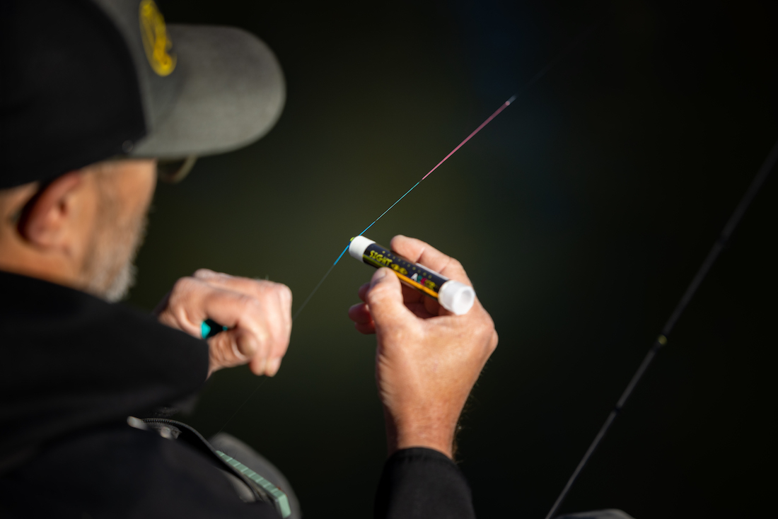 Conseil : il est plus facile d'appliquer la couleur lorsque le bas de ligne ou le tippet est maintenu sous tension. Il suffit de passer le stylo 1 à 2 fois en biais sur le matériau, et c'est tout ! Après une minute au maximum, ton Sighter est prêt à l'emploi et ne laisse aucun résidu.