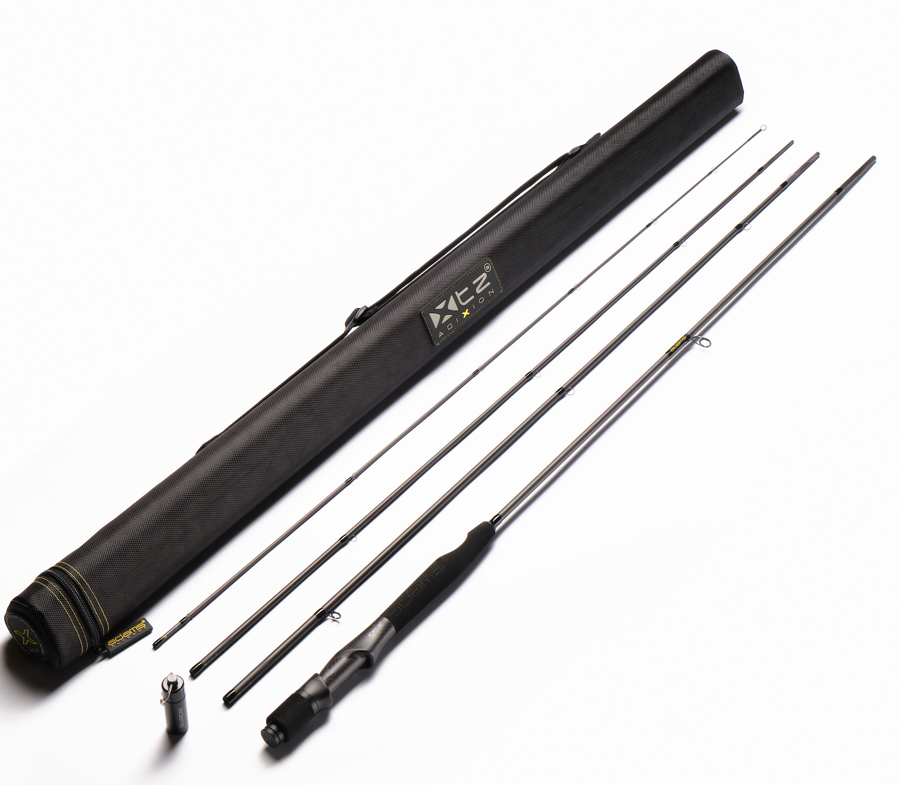 Le cœur de cette canne est le nouveau développement de la poignée et du porte-moulinet, qui se compose d'une poignée EVA et d'un porte-moulinet en carbone tissé à la main. Les deux éléments sont fusionnés en une seule unité, ce qui assure non seulement le confort et un excellent feedback, mais augmente aussi la sensibilité en transmettant les vibrations du Blank directement à la main. La poignée raccourcie permet d'atteindre le Blank sans effort avec l'index, tout en gardant la main près du moulinet, ce qui donne une toute nouvelle sensation d'équilibre.La canne semble globalement plus légère, ce qui permet de la guider avec encore plus de précision, aussi bien lors du lancer que pendant la dérive. Le porte-moulinet en carbone tissé à la main fait également office de Fighting Butt et intègre le système de poids réglable développé avec ZMK. Trois poids amovibles individuellement permettent un réglage précis et fin de l'équilibre, et comme il n'y a pas de pas de vis visible, le moulinet reste bien en place en permanence, sans qu'il soit nécessaire de le resserrer. Le blank de la XTZ ADIXION est fabriqué en carbone Toray multidirectionnel et utilise notre technologie X-Torzion qui empêche la torsion sous charge et maintient la canne parfaitement stable. Ainsi, le contrôle reste constant à tout moment lors du lancer et du combat. Grâce au carbone préimprégné avec un taux de résine réduit, le Blank est plus léger, plus croquant et particulièrement réactif. Le scion a été encore affiné pour présenter proprement les plus petites nymphes et réduire l'éclatement des petits poissons, tandis que la puissante pièce à main offre toujours suffisamment de réserves pour les plus gros poissons. Comme pour la précédente série XTZ, Adams Fly Rods a opté pour un Blank non rectifié qui réduit le collage de la ligne lorsqu'elle est mouillée et qui ne nécessite pas de Monowrap. La finition mate donne un look discret et fonctionnel avec une légère propriété anti-adhérente.