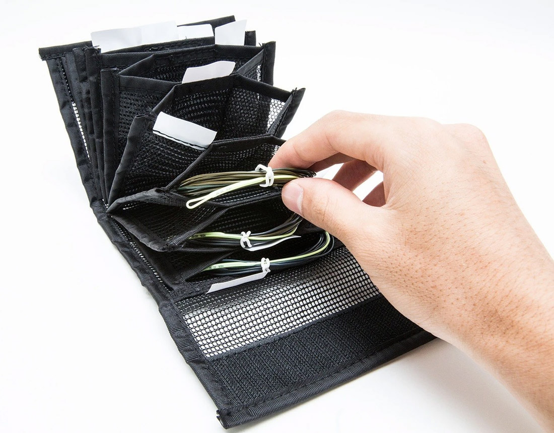 Le tissu mesh du Sink Tip Wallet permet à tes tips de sécher rapidement et évite ainsi l'apparition de bâton ou de moisissure sur tes précieuses lignes. La fermeture du sac (9 compartiments individuels) est faite d'une bande velcro extra-résistante qui ne craint pas la corrosion. Les étiquettes disposées en quinconce peuvent être étiquetées afin de pouvoir reconnaître d'un coup d'œil quel stip de descente tu as rangé à quel endroit. Ainsi, tu es toujours parfaitement organisé et tu as tous tes sinktips sous les yeux et à portée de main.