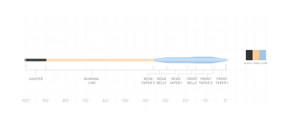 L'Amplitude Smooth Tarpon possède un taper court et agressif qui charge rapidement les cannes à mouche modernes et permet des présentations rapides dans des situations mouvementées. Le Taper à charge frontale transporte les mouches lestées et volumineuses jusqu'à la cible avec assurance, même par vent fort. Une autre nouveauté de l'Amplitude Smooth Tarpon est l'extrémité noire très contrastée de la soie, qui t'aide à évaluer la position du poisson et sa distance par rapport aux structures lors de longs runs jusqu'en backing - une caractéristique intéressante, en particulier à proximité des piliers de pont, des bords de récifs et des mangroves.
