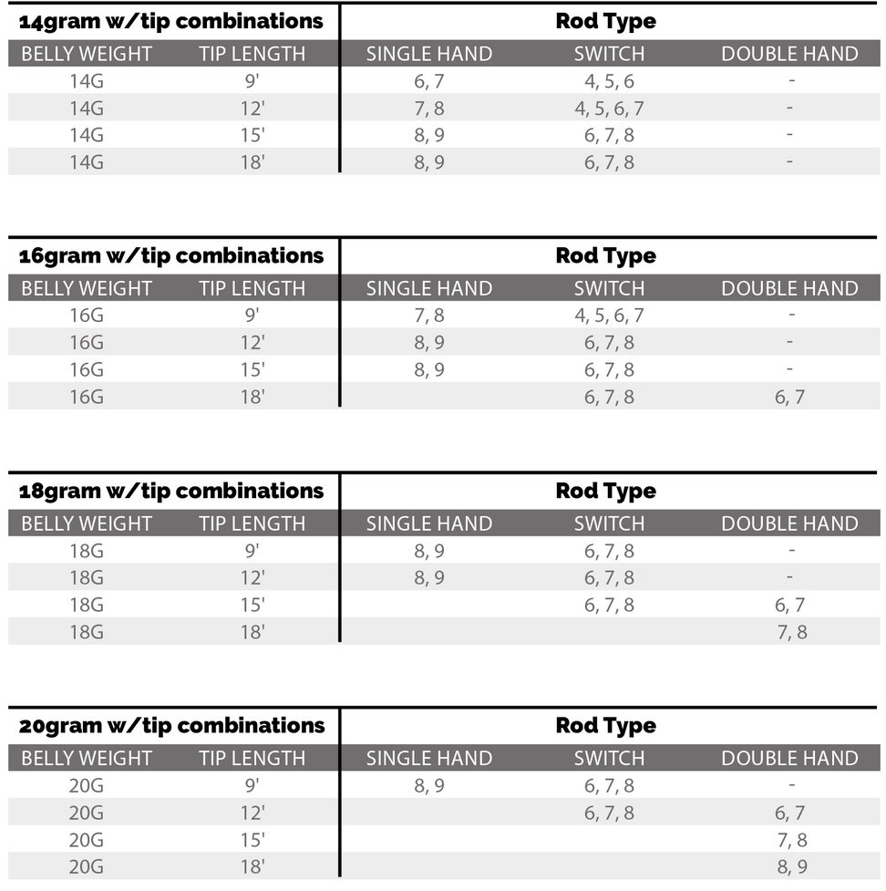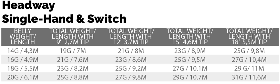 Les têtes de tir à une main Headway sont conçues pour fonctionner parfaitement en combinaison avec les Sinktips de la série Headway. Ainsi, le système devient extrêmement flexible - du point de vue de la pêche mais aussi du point de vue du lancer. En effet, les propriétés de lancer peuvent être adaptées aux exigences respectives en fonction de la longueur et du poids du tip. Mais attention : sans un sinktip, les têtes ne fonctionnent pas correctement. Tu trouveras les poids adaptés et les combinaisons possibles dans les tableaux (photos des produits).