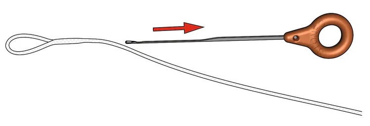 Lors de l'épissure, l'enrobage est retiré de la ligne à mouche et la tresse est enfoncée à l'aide d'une aiguille afin de l'ancrer sur elle-même, comme pour un Braided Loop.