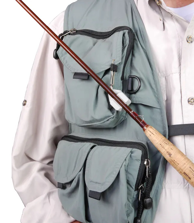 Le rod holder est fixé en toute sécurité au gilet à l'aide d'un mousqueton qui peut être fermé. Le porte-canne est en high elastic rubber, un caoutchouc qui assure un maintien sûr de la canne et une énorme adhérence sur les blanks lisses. L'effet de serrage du porte-canne fonctionne au mieux avec des diamètres de blank de 7 à 10 mm, donc pour presque toutes les cannes à mouche, car la partie conique de la poignée permet toujours de trouver le diamètre adéquat.
