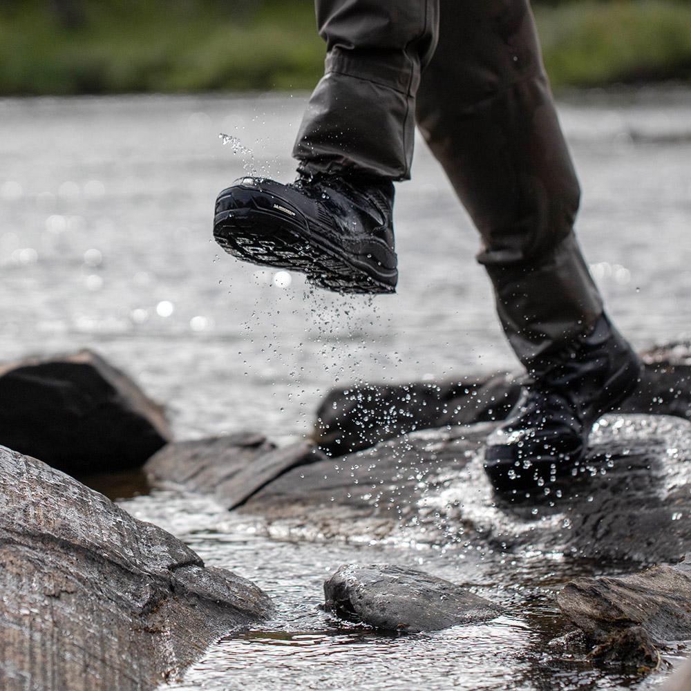 Le mélange de gomme lui-même est un mélange d'un pneu tout-terrain et d'un pneu hiver scandinave. Tout comme les pneus d'hiver non cloutés sur la neige, ces semelles offrent une très bonne adhérence sur les rochers. Plus on exerce de pression sur la semelle, plus elle s'accroche au rocher, car le mélange souple avec les crampons s'adapte au sol irrégulier. En plus d'une meilleure adhérence, la chaussure procure une sensation très particulière lors du passage à gué. La semelle extérieure souple et bien adaptable, combinée à la semelle intermédiaire flexible en EVA, te permet de sentir ce qui se trouve sous ta chaussure. En même temps, la semelle offre suffisamment d'adhérence même dans les conditions les plus difficiles. Lors de longues randonnées, la chaussure continue à se dérouler confortablement et offre une bonne rigidité en torsion.